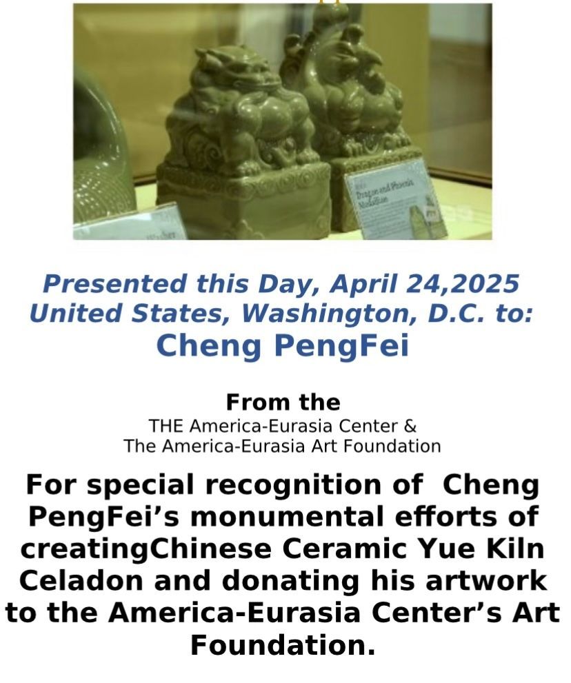 Medium: Chinese ink and color on paperand a piece of Yue Kiln Celadon. The donation underscores the Eurasia Center's steadfast commitment to fostering people-to-people diplomacy between the United States and Eurasian countries. AEAF perceives this contribution as a crucial initiative to enhance public awareness and promote mutual understanding between the United States and Asia. The incorporation of these artworks will enhance the Foundation’s efforts at the intersection of cultural diplomacy, cross-cultural collaboration, and artistic education.