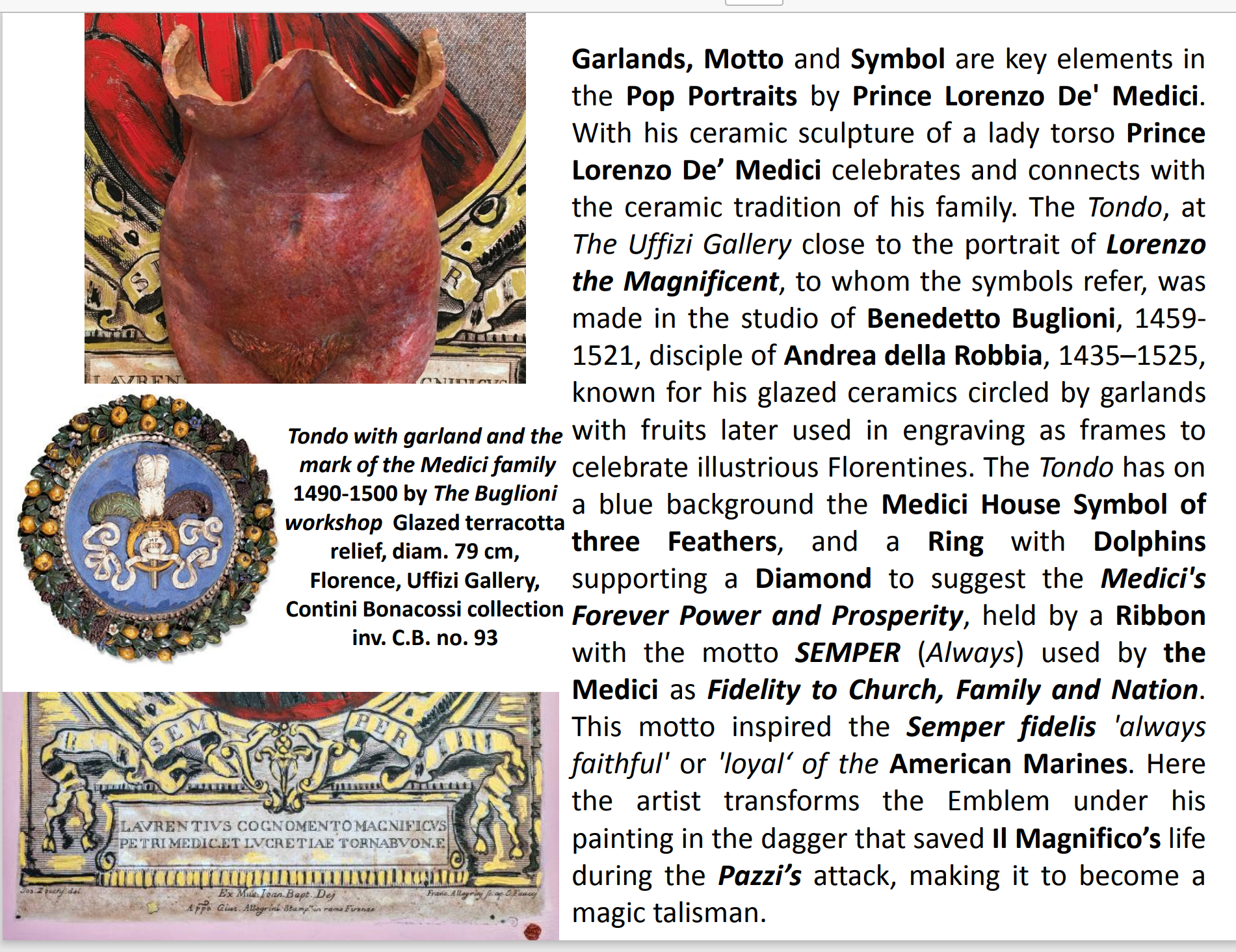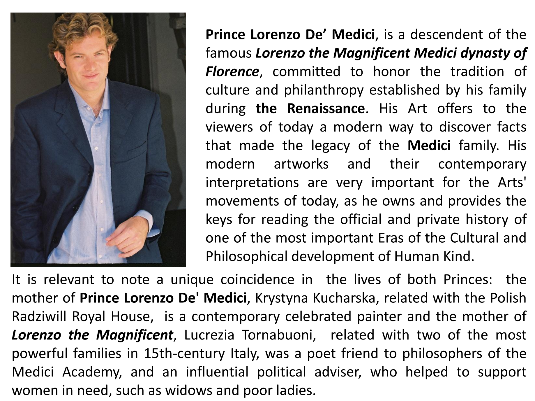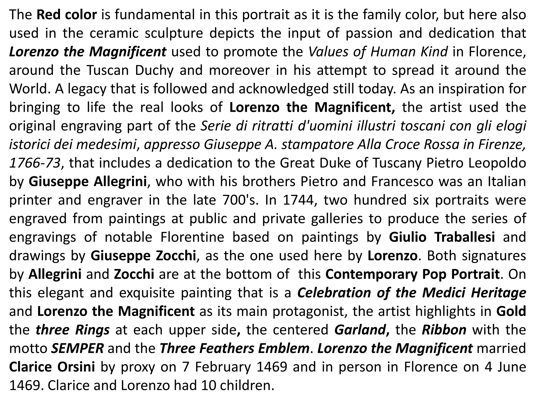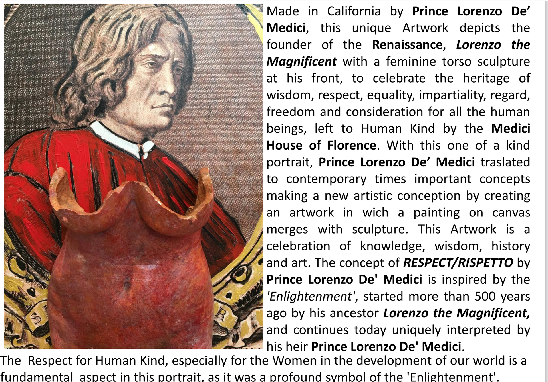 Prince Lorenzo De’ Medici, is a descendent of the famous Lorenzo the Magnificent Medici dynasty of Florence, committed to honor the tradition of culture and philanthropy established by his family during the Renaissance. His Art offers to the viewers of today a modern way to discover facts that made the legacy of the Medici family
