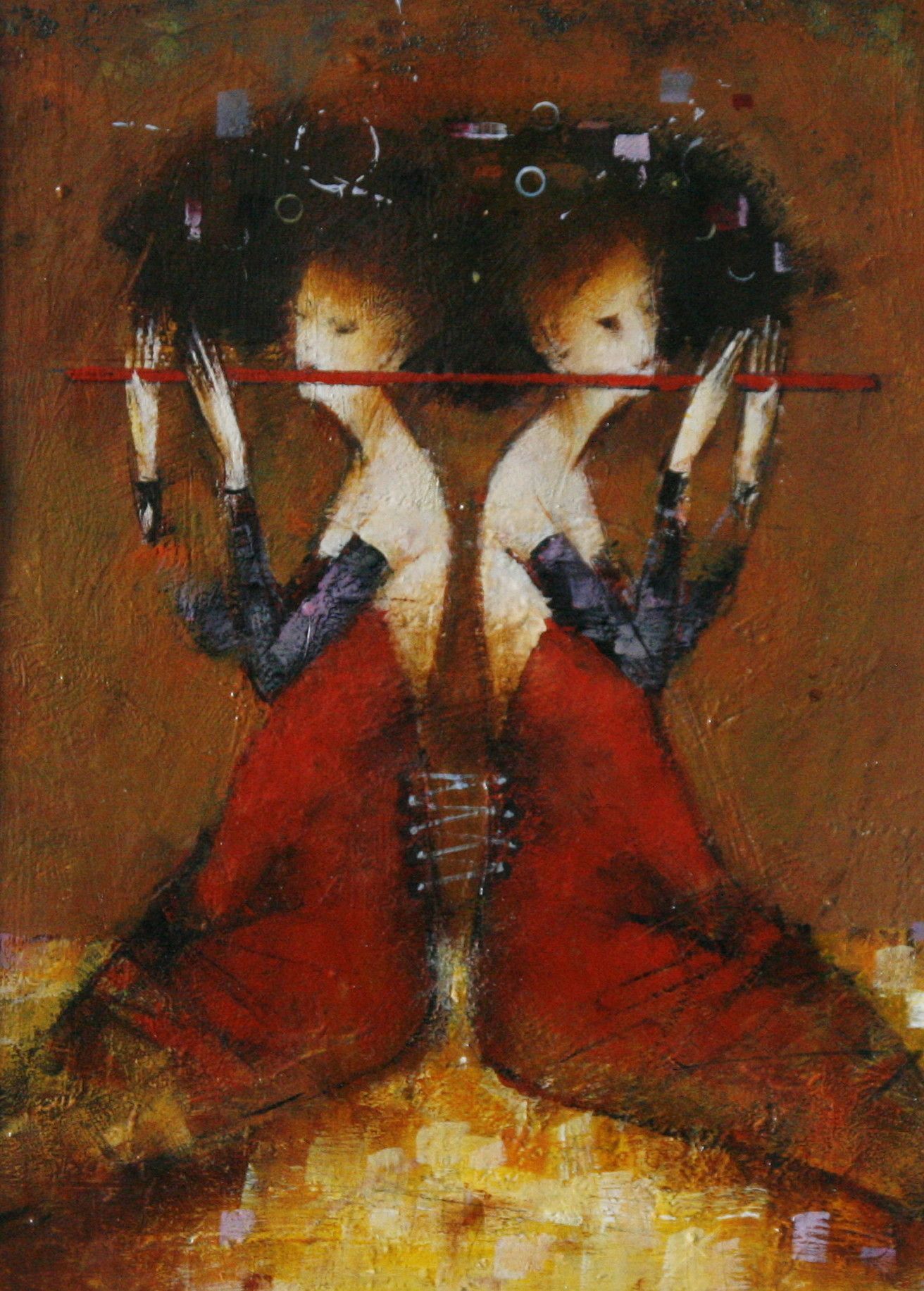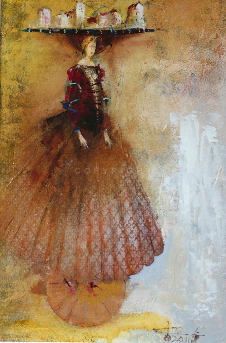 The author is not afraid of using different textures, formats and techniques - a single theme, one size canvas and uniform thinking are not sufficient for attempting to reflect the 'great experiment of life'. Creative work, like life itself, is a constantly changing process which dictates new forms pf expression, brush strokes and moods for every piece of work. However all of them are unified by clearly expressed spirituality. Using innovative means of expression, the mystical, pagan philosophy is made accessible to modern understanding, perhaps reminding what has been forgotten. The exalted primeval, cosmic nature of woman emits tranquility and the scent of a lotus flower... These are the icons of the 21st century.